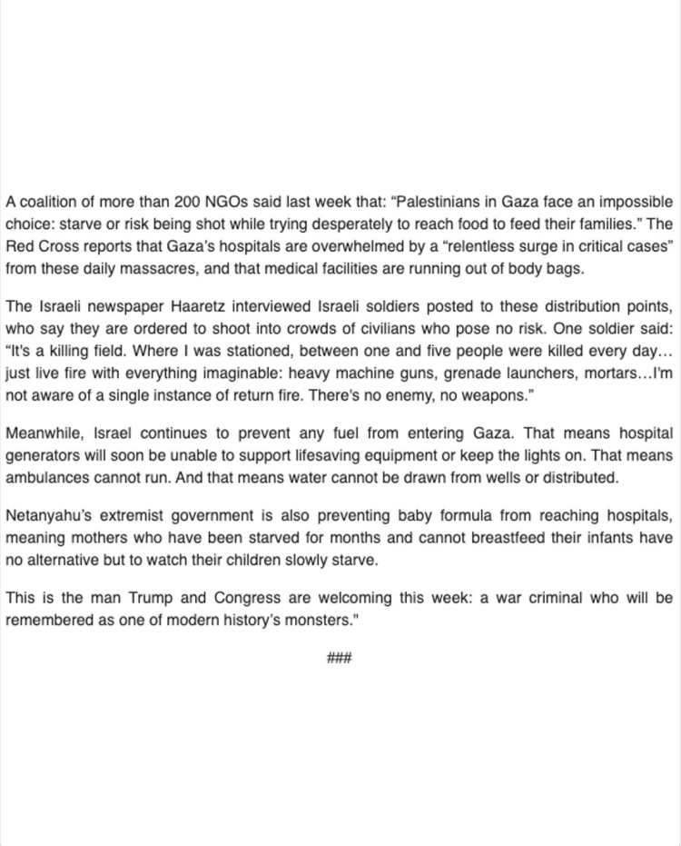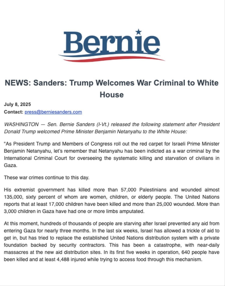Sanders, Netanyahu hükümetinin bebek mamalarının bile girişini engelleyerek anneleri çocuklarının açlıktan yavaş yavaş ölümünü izlemeye mahkum ettiğini söyledi. Açıklamasını, "Donald Trump ve Kongre'nin bu hafta ağırladığı adam, modern tarihin canavarlarından biri olarak hatırlanacak bir savaş suçlusudur" şeklindeki sert ifadelerle sonlandırdı.