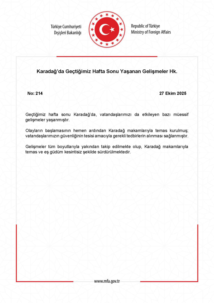 Gelişmeler tüm boyutlarıyla yakından takip edilmekte olup, Karadağ makamlarıyla temas ve eşgüdüm kesintisiz şekilde sürdürülmektedir.”