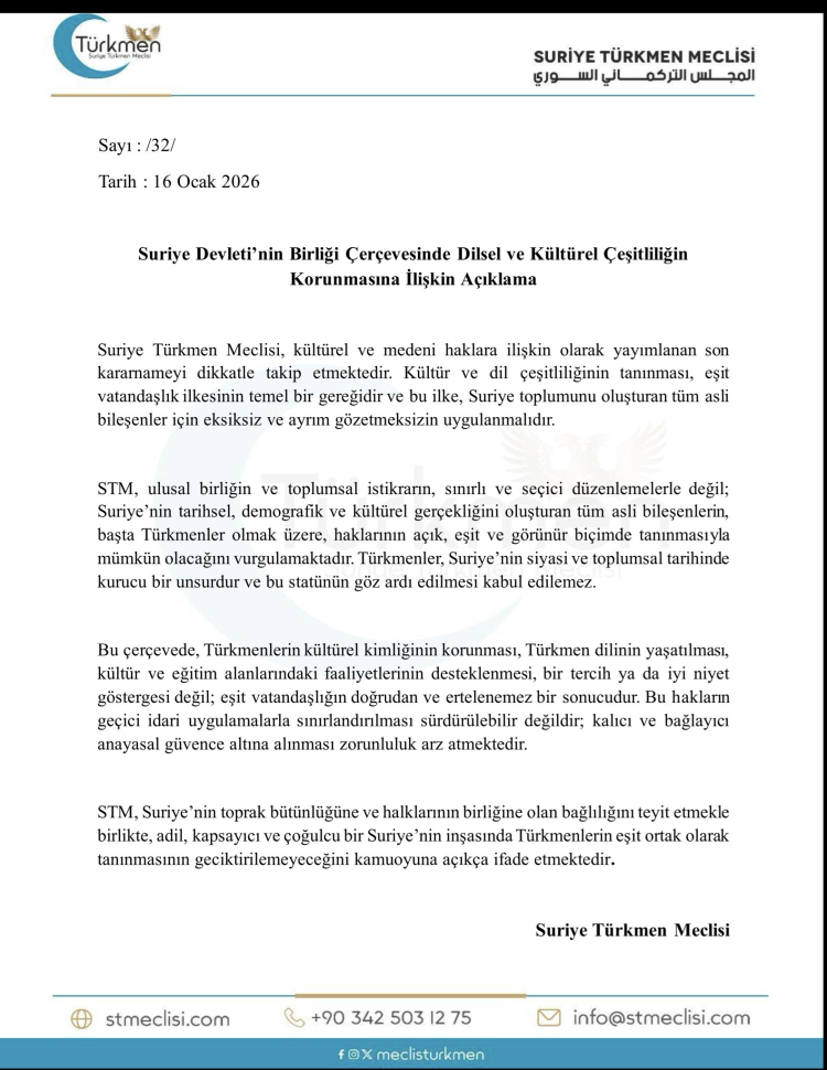 ''Suriye Türkmen Meclisi, kültürel ve medeni haklara ilişkin olarak yayımlanan son kararnameyi dikkatle takip etmektedir. Kültür ve dil çeşitliliğinin tanınması, eşit vatandaşlık ilkesinin temel bir gereğidir ve bu ilke, Suriye toplumunu oluşturan tüm asli bileşenler için eksiksiz ve ayrım gözetmeksizin uygulanmalıdır. STM, ulusal birliğin ve toplumsal istikrarın, sınırlı ve seçici düzenlemelerle değil; Suriye'nin tarihsel, demografik ve kültürel gerçekliğini oluşturan tüm asli bileşenlerin, başta Türkmenler olmak üzere, haklarının açık, eşit ve görünür biçimde tanınmasıyla mümkün olacağını vurgulamaktadır. Türkmenler, Suriye'nin siyasi ve toplumsal tarihinde kurucu bir unsurdur ve bu statünün göz ardı edilmesi kabul edilemez. Bu çerçevede, Türkmenlerin kültürel kimliğinin korunması, Türkmen dilinin yaşatılması, kültür ve eğitim alanlarındaki faaliyetlerinin desteklenmesi, bir tercih ya da iyi niyet göstergesi değil; eşit vatandaşlığın doğrudan ve ertelenemez bir sonucudur. Bu hakların geçici idari uygulamalarla sınırlandırılması sürdürülebilir değildir, kalıcı ve bağlayıcı anayasal güvence altına alınması zorunluluk arz atmektedir. STM, Suriye'nin toprak bütünlüğüne ve halklarının birliğine olan bağlılığını teyit etmekle birlikte, adil, kapsayıcı ve çoğulcu bir Suriye'nin inşasında Türkmenlerin eşit ortak olarak tanınmasının geciktirilemeyeceğini kamuoyuna açıkça ifade etmektedir.