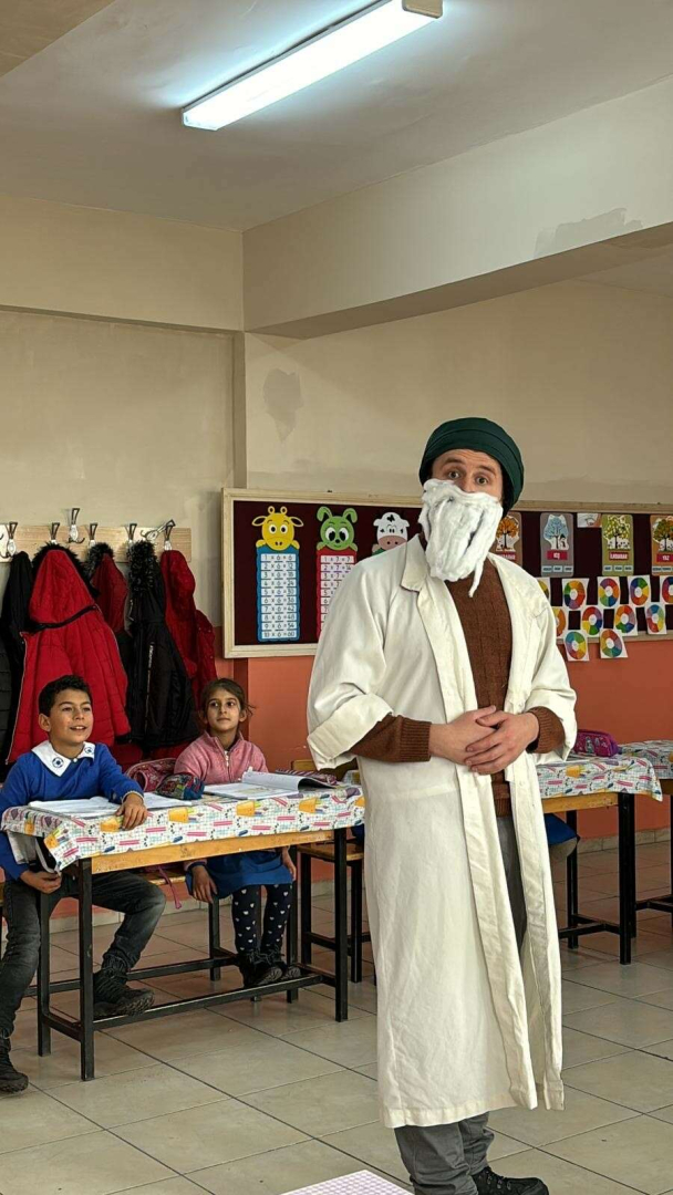 Dede Korkut'un hikâyelerini canlandırarak anlatan öğretmen öğrencilerini eğlendirdi