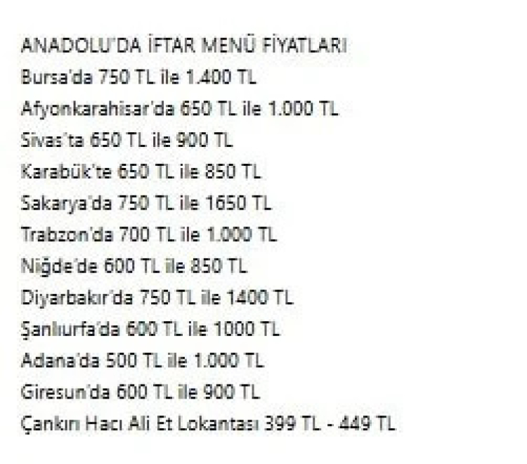 İstanbul'daki popüler restoranlarda iftar menülerindeki fiyat artışı ortalama %32 seviyelerinde. Ancak asgari ücretlinin maaş artışı sadece %30 olduğu için, restoranlardaki bu fiyat artışları vatandaşın alım gücünü zorladı. Asgari ücretle geçinen pek çok kişi, dışarıda iftar yapma lüksüne sahip olamayacak durumda. Uygun fiyatlı seçenekler 550 TL’den başlarken, lüks mekanlarda iftar menüleri 6.000 TL'ye kadar yükseldi.