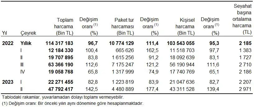 Seyahate çıkan kişi, seyahat ve geceleme sayıları, II. Çeyrek: Nisan-Haziran, 2023Yerli turistlerin yurt içinde yaptığı seyahatler sırasında harcamaları da arttı. 2023 yılının II. çeyreğinde yurt içi seyahat harcamaları bir önceki yılın aynı çeyreğine göre %142,5 artışla 47 milyar 792 milyon 417 bin TL olarak gerçekleşti. Bu harcamaların %90,6'sı kişisel harcamalardan oluşurken %9,4'ü paket tur harcamalarından kaynaklandı. Seyahat başına ortalama harcama 2 bin 971 TL olarak hesaplandı.