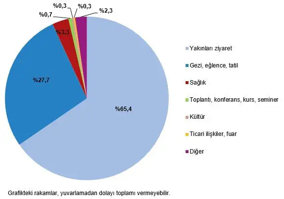 Seyahate çıkış amacı açısından değerlendirildiğinde, en fazla seyahat nedeni %65,4 ile "yakınları ziyaret etmek" oldu. Bu amaçla yapılan seyahatlerin ardından %27,7 ile "gezi, eğlence ve tatil" ve %3,3 ile "sağlık" amacıyla yapılan seyahatler geldi.