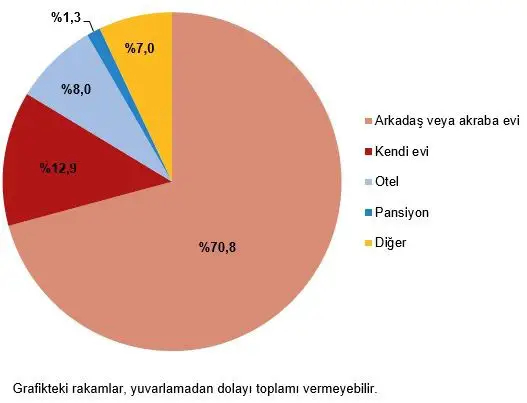 Seyahate çıkanların konaklama tercihleri incelendiğinde, bu dönemde 70 milyon 880 bin konaklama ile en fazla "arkadaş veya akraba evinde" kalındığı görüldü. İkinci sırada 12 milyon 872 bin konaklama ile "kendi evi" yer alırken, "oteller" ise 8 milyon 5 bin konaklama ile üçüncü sıradaydı.