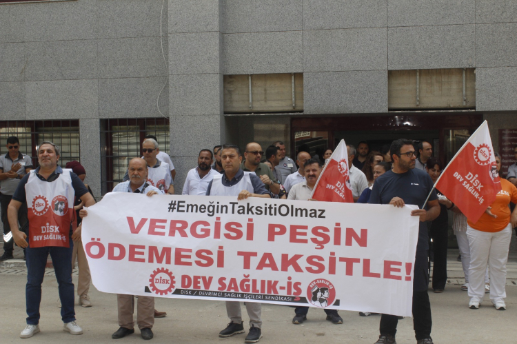 Çukurova Üniversitesi Balcalı Hastanesi’nde çalışan bin 600 işçi 696 sayılı KHK ile taşeron sisteminden kadroya geçerek 4/D statüsünde istihdam edilmeye başlandı. Bu işçiler ocak ayından bu yana toplu iş sözleşmesinden kaynaklanan yaklaşık 120 bin lira farklarını alamayınca perşembe günü iş bırakma yavaşlatma eylemi yapmıştı. Bugün Balcalı Hastanesi Başhekimliği önünde toplanan DİSK ve Dev Sağlık-İş üyesi sağlık çalışanları, düzenledikleri basın açıklamasıyla taleplerini kamuoyuna duyurdu. Açıklamayı Dev Sağlık-İş Çukurova Bölge Temsilcisi Hüseyin Türkmen okudu.