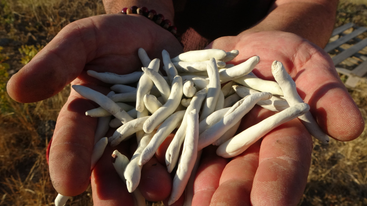 Çapa yardımıyla bitkinin kökünü açığa çıkaran Demirkaya, kökü bıçakla çapraz keserek sakızın oluşmasını sağlayan sıvının dışarı çıkmasına yardımcı oluyor. Toprakta bir gün bekleyerek sertleşen sıvı daha sonra toplanıyor.