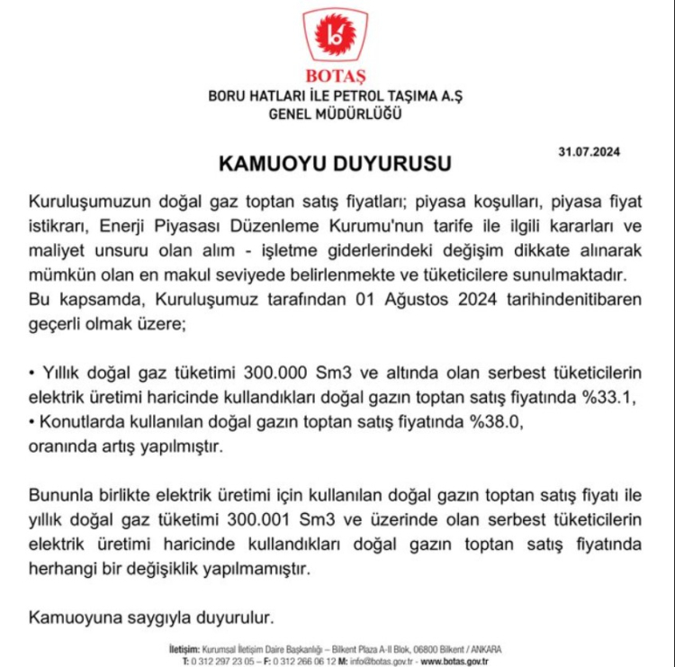 1 Ağustos 2024 tarihinden itibaren konutlarda kullanılan doğal gazın toptan satış fiyatına yüzde 38 oranında zam yapıldı. Boru Hatları ile Petrol Taşıma AŞ (BOTAŞ) tarafından yapılan açıklamada, doğal gaz fiyatlarına yapılan bu büyük artışın, tüketicilerin enerji maliyetlerini önemli ölçüde artıracağı belirtildi.