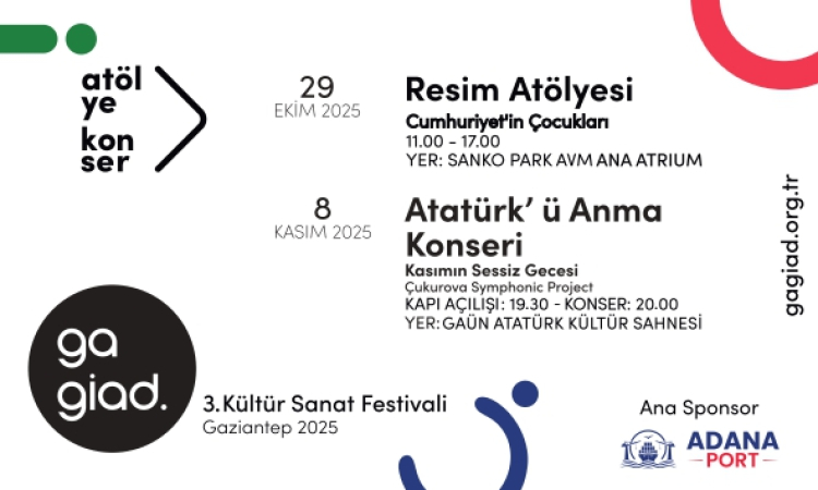Adana Port ana sponsorluğunda; Güllüoğlu Baklavaları – Ömer Güllü ve Sınır Beton Elemanları proje destekçiliğinde düzenlenecek GAGİAD 3. Kültür Sanat Festivali 2025, Gazianteplileri ve şehri ziyaret eden sanatseverleri çok yönlü bir programla buluşturacak. 29 Ekim ve 8 Kasım 2025 tarihleri arasında sürecek festival; “Cumhuriyet’in Çocukları” Resim Atölyesi, “Cumhuriyet’in Nefesi: Ormanlar” Sergisi ve “Atatürk’ü Anma Konseri: Kasım’ın Sessiz Gecesi” gibi seçkin etkinliklerle şehri sanatın evrensel diliyle yeniden buluşturacak.