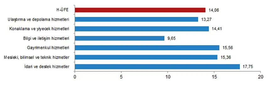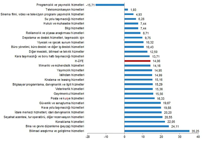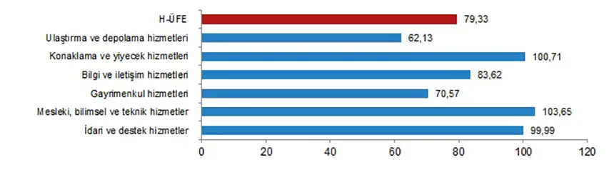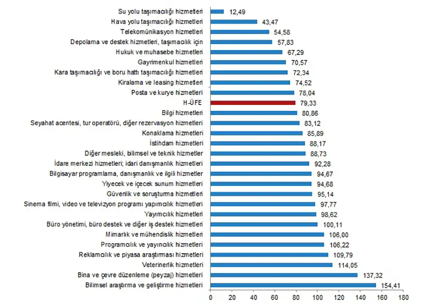 H-ÜFE sektörlerinden su yolu taşımacılığı hizmetleri yüzde 12,49, hava yolu taşımacılığı hizmetleri yüzde 43,47, telekomünikasyon hizmetleri yüzde 54,58 ile endekslerin en az arttığı alt sektörler oldu. Buna karşılık bilimsel araştırma ve geliştirme hizmetleri yüzde 154,41, bina ve çevre düzenleme (peyzaj) hizmetleri yüzde 137,32, veterinerlik hizmetleri yüzde 114,05 ile endekslerin en fazla arttığı alt sektörler oldu.