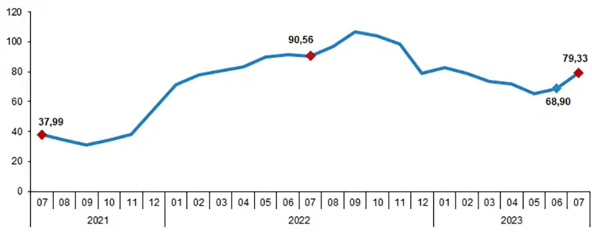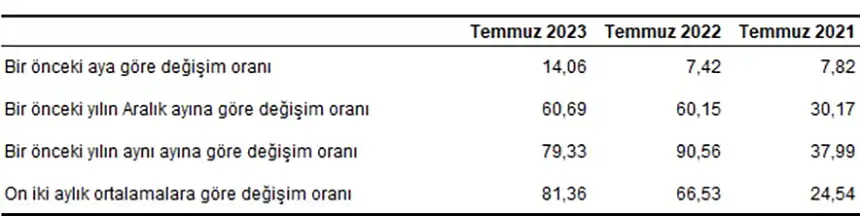 Hizmet Üretici Fiyat Endeksi (H-ÜFE), Temmuz ayında bir önceki aya göre yüzde 14,06, bir önceki yılın aynı ayına göre ise yüzde 79,33 arttı.