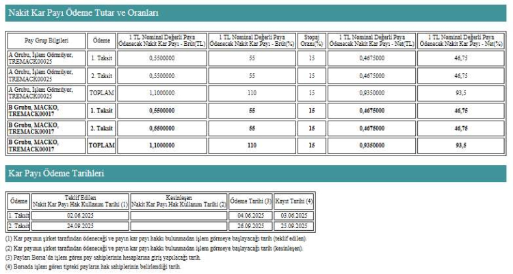 Mackolik, 2024 yılı karından toplam 0,9350 TL net temettü ödemesi yapacağını duyurdu. Ödemeler, iki taksit halinde 4 Haziran ve 26 Eylül 2025 tarihlerinde gerçekleştirilecek.