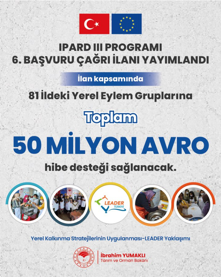 Tarım ve Orman Bakanı İbrahim Yumaklı, IPARD III Programı 6’ncı Başvuru Çağrı İlanı ile 81 ildeki yerel eylem gruplarına yüzde 100 hibeli toplam 50 milyon avro destek sağlanacağını açıkladı. Başvurular 2 Haziran’da başlayacak.