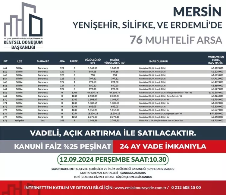 Arsalar, yüzde 25 peşin ödeme ve 24 ay vade fırsatı ile satışa sunulacak. Açık artırmalar, 10-12 Eylül tarihlerinde saat 10.30’da yapılacak. Adana'daki açık artırma TOKİ İstanbul Hizmet Binası Konferans Salonu’nda, Mersin’deki ise Çevre Şehircilik ve İklim Değişikliği Konferans Salonu’nda gerçekleştirilecek.