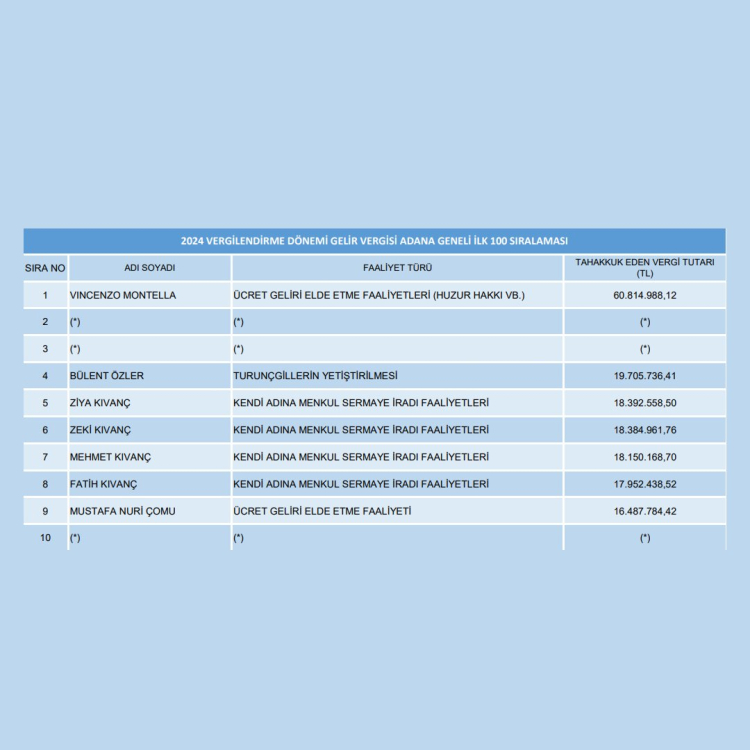 2. ve 3. sırada yer alan isimler adının açıklanmasını istemezken; Turunçgil yetiştiren Bülent Özler ise 19.7 milyon TL vergi ödeyerek 4. sırada yer aldı. 5. sırada yer alan Ziya Kıvanç ise, kendi adına menkul sermaye iradı faaliyetleriyle 18.3 milyon TL vergi ödedi. Adana'nın vergi rekortmeni Montella 2 Eylül 2021-30 Haziran 2023 tarihleri arasında Adana Demirspor teknik direktörü olarak görev alıyordu.