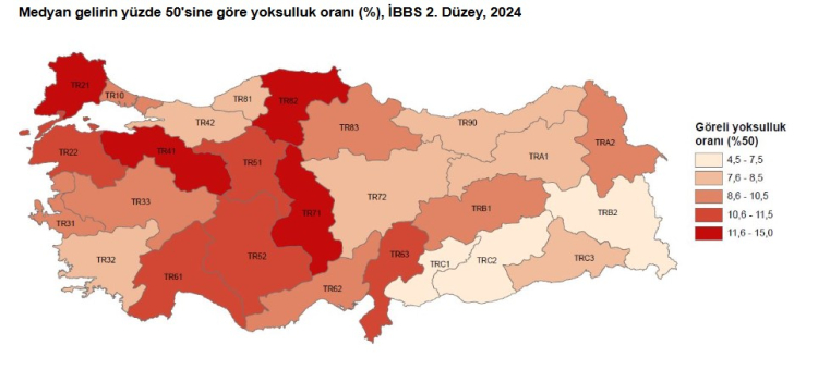 Bölgesel analizlere göre, yoksulluk oranının en yüksek olduğu bölgeler ise TR71 (Kırıkkale, Aksaray, Niğde, Nevşehir, Kırşehir) %14,6 ile ilk sırada yer aldı. TR82 (Kastamonu, Çankırı, Sinop) bölgesinde ise yoksulluk oranı %12,3 olarak kaydedildi.