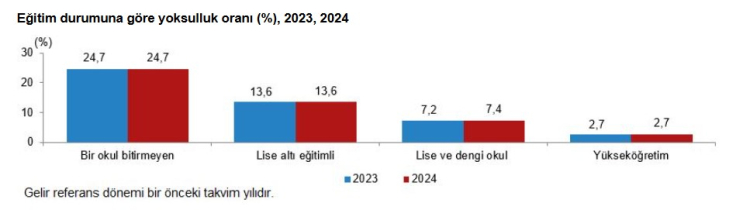 Eğitim durumu da yoksulluk oranını önemli ölçüde etkileyen bir faktör. 2024 yılı verilerine göre, bir okul bitirmeyenlerin yoksulluk oranı %24,7 gibi yüksek bir seviyeye ulaşırken, lise altı eğitimlilerde bu oran %13,6, lise ve dengi okul mezunlarında ise %7,4 oldu. En düşük yoksulluk oranı ise yükseköğretim mezunlarında %2,7 ile kaydedildi.