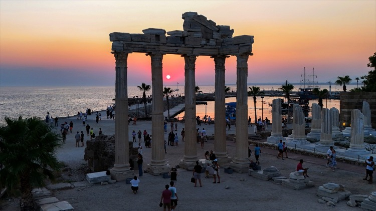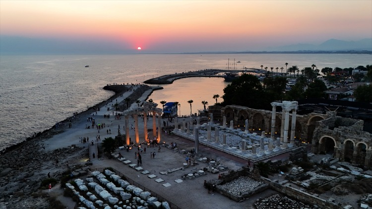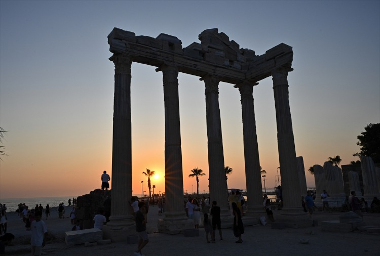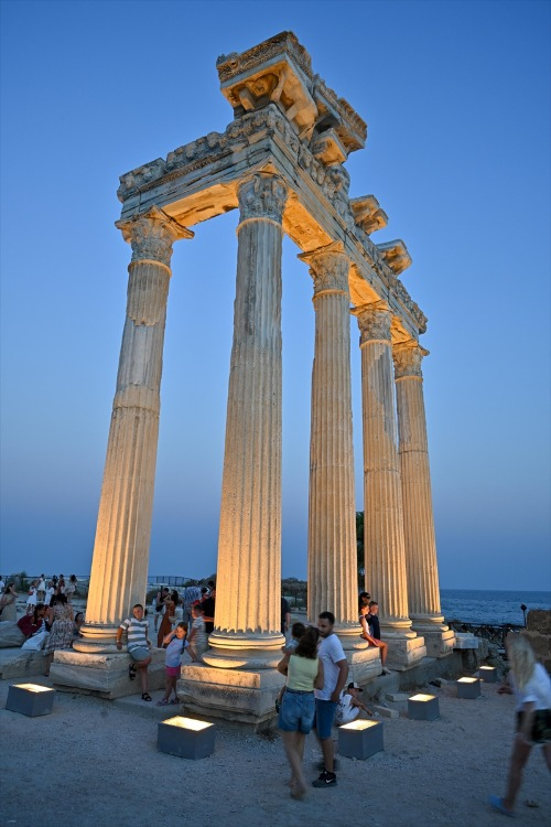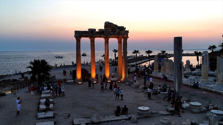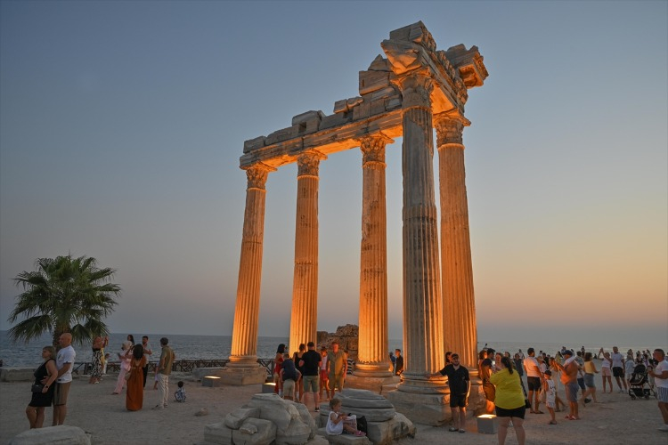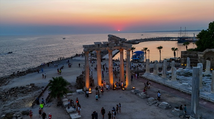 Manavgat ilçesinde yer alan ve Akdeniz’in en görkemli tarihi yapılarından biri olan Apollon Tapınağı, gün batımıyla birleşen sütunlarıyla ziyaretçilerini büyülüyor. İşte büyüleyici kareler eşliğinde Side’nin tarihi simgesi...