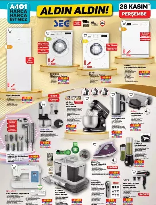 A101, bu hafta yine geniş bir ürün yelpazesi sunuyor; Buzdolabı 9.299 TL, Çamaşır Makinesi 11.999 TL, Bluetooth Kulaklık 299 TL gibi pek çok ürün raflarda olacak. Ayrıca, mutfak gereçlerinden Tava-Sahan Seti 599 TL, Mini Metal El Aletleri 39 TL, Kamp Çaydanlığı 529 TL ve Sıcak Su Torbası 59 TL gibi fırsatlar da mevcut.