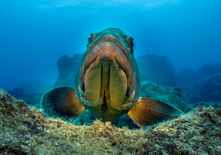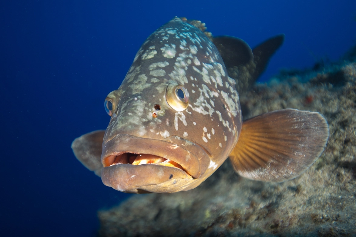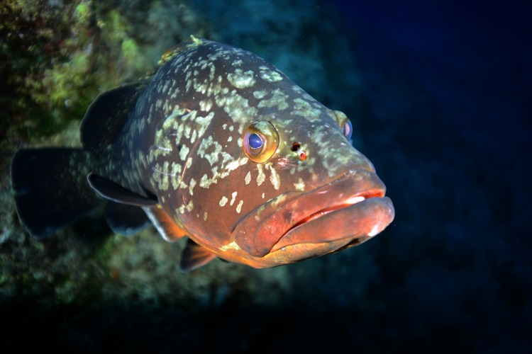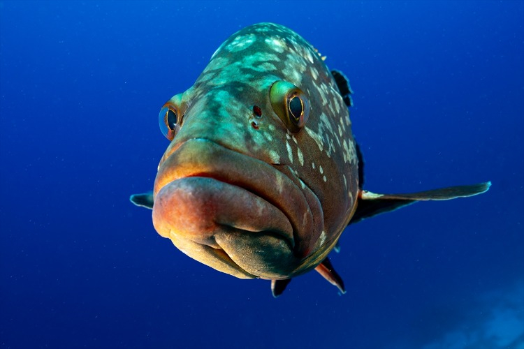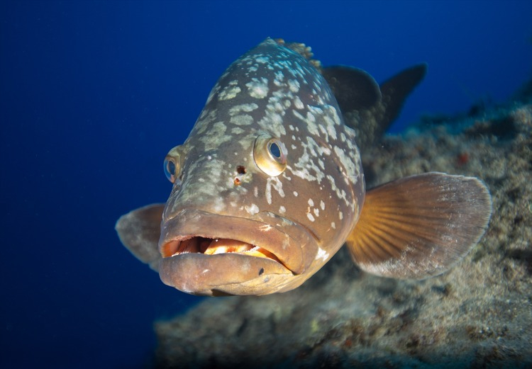 Mavilikler arasında sakince süzülen bir orfoz balığı… Kaş açıklarında nadir bir karşılaşma.