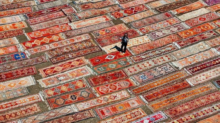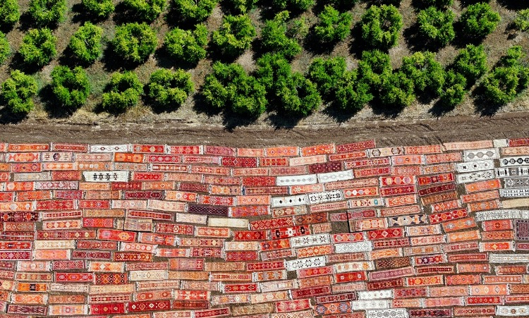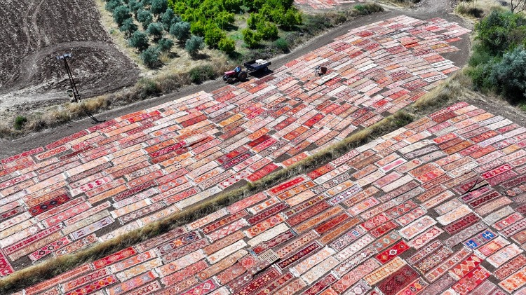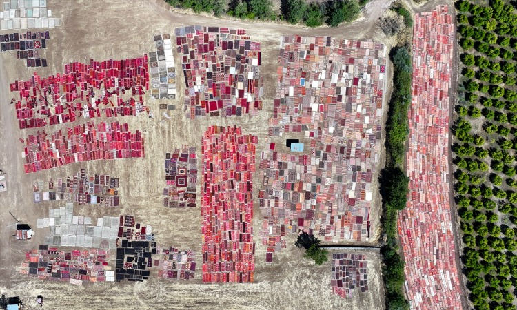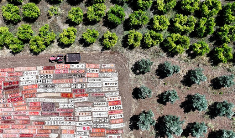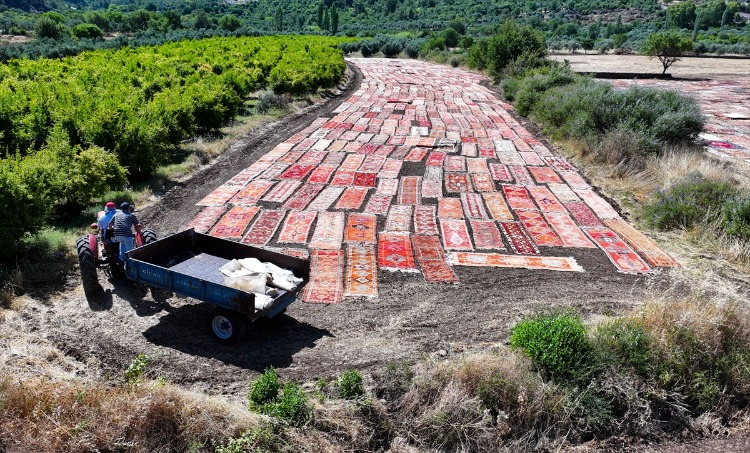 Türkiye’nin farklı illerinden toplanan, kök boyasıyla renklendirilmiş ve Yörük motifleriyle süslenmiş el dokuması halılar, Döşemealtı’ndaki yüzlerce dönümlük arazide kurutuluyor. Halılar, sıcak güneş altında renklerini kaybedip pastelleşiyor, bu da onları özellikle yurt dışındaki koleksiyoncu ve tasarımcılar arasında daha kıymetli hale getiriyor.