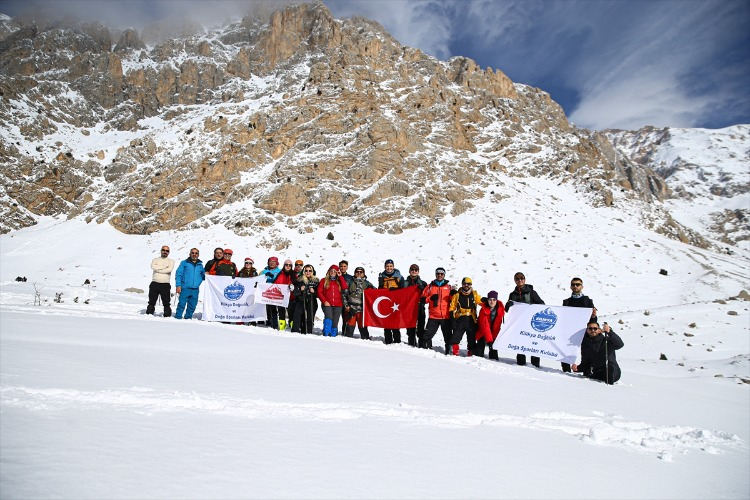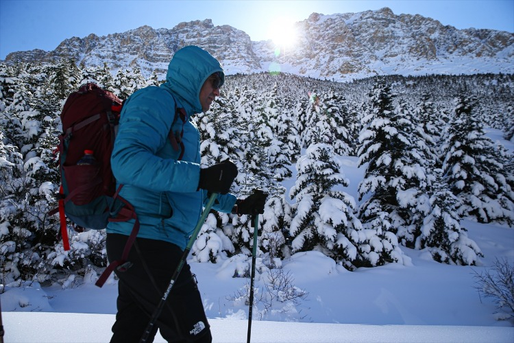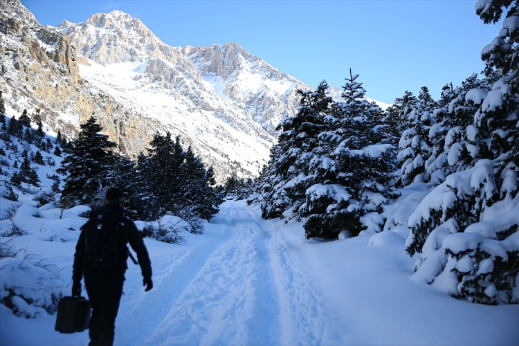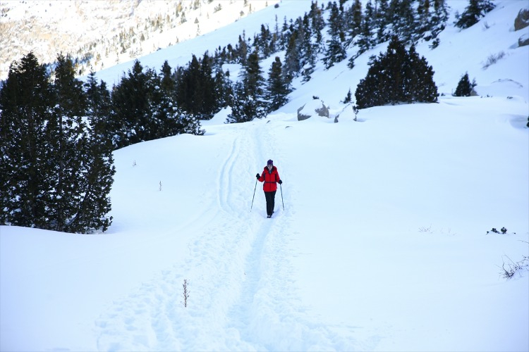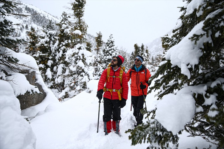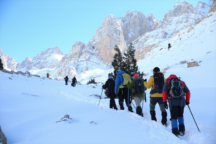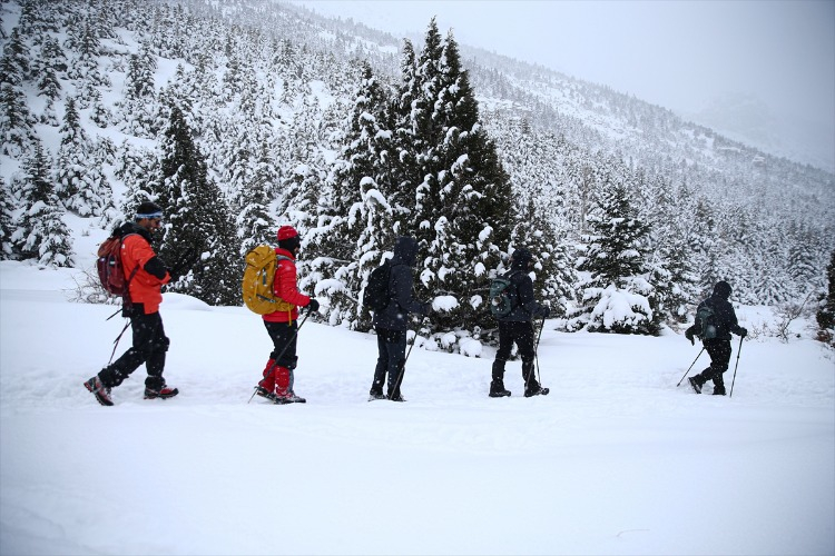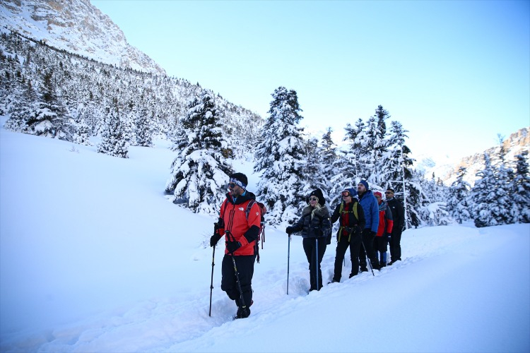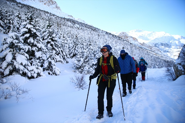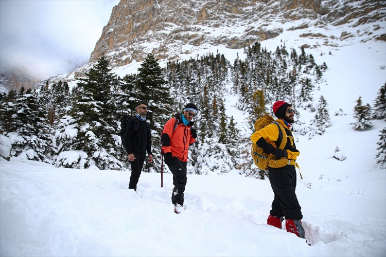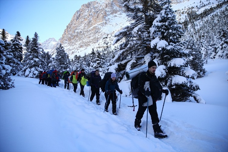 Ağaçların arasındaki karla kaplı yolları aşan dağcılık tutkunları, hem fiziksel dayanıklılıklarını test ediyor hem de temiz hava ve doğal güzelliklerin keyfini çıkarıyor. Bu kapsamda, Adana’dan Aladağlar Milli Parkı’nın Niğde sınırlarında bulunan Emli Vadisi’ne giden Kilikya Dağcılık ve Doğa Sporları Kulübü’nün 26 üyesi, zorlu parkurda ilerledikten sonra kamp yaptı.