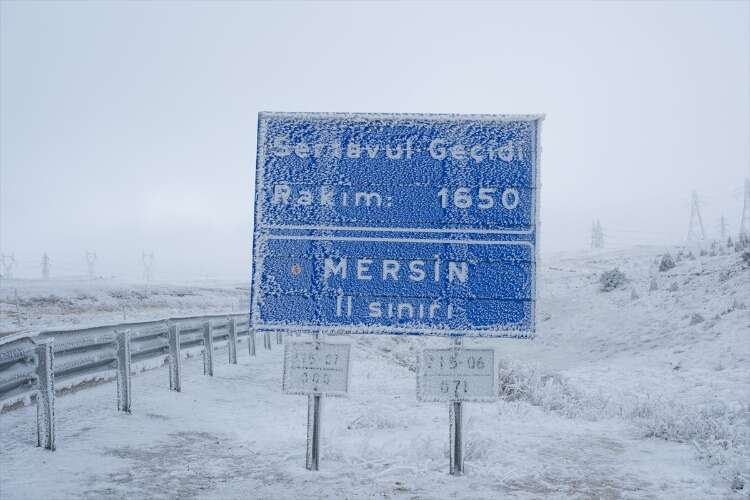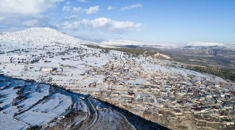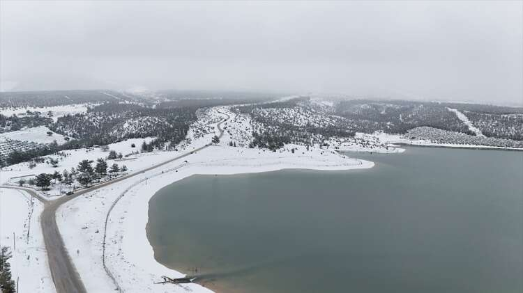 Mersin'in Mut ilçesinde etkili olan kar yağışının ardından Hacınuhlu Kelce Göleti ve çevresi, beyaza büründü.