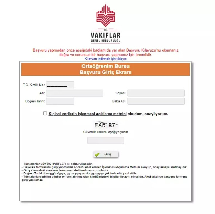 Vakıflar Genel Müdürlüğü burs başvuruları yalnızca internet adresi üzerinden çevrim içi olarak gerçekleştiriliyor. Başvurular masaüstü bilgisayar veya dizüstü bilgisayar üzerinden yapılması tavsiye ediliyor. Tarayıcı olarak Internet Explorer, Google Chrome veya Mozilla Firefox kullanılabilir.