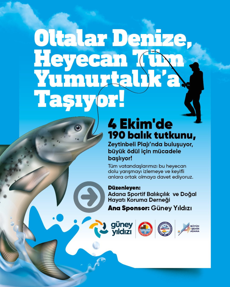 Adana Sportif Balıkçılık Derneği tarafından düzenlenen özel balıkçılık yarışması 4 Ekim’de Yumurtalık’ta gerçekleştirilecek. Etkinliğe Türkiye’nin dört bir yanından 190 balık tutkunu katılacak ve Zeytinbeli Sahili’nden oltalarını suya atarak en büyük ve en güzel balığı yakalamak için kıyasıya mücadele edecek.