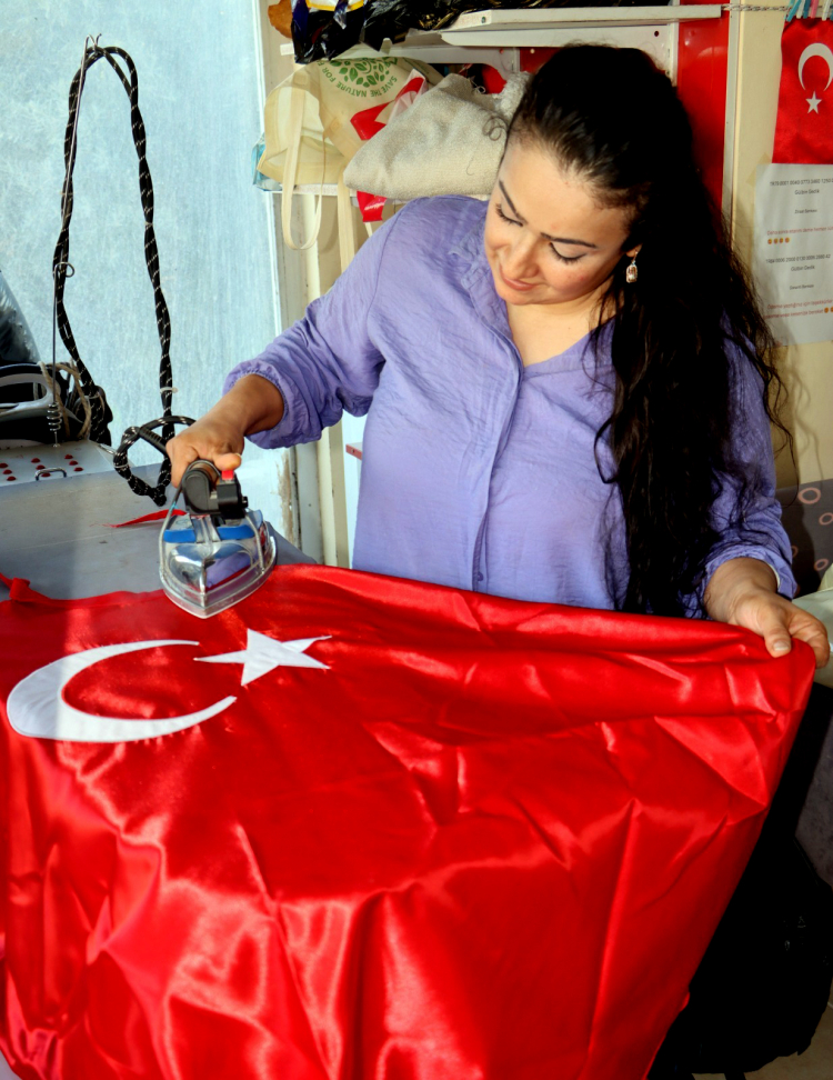 Çocukların "Gülbin Ablası" Gülbin Gedik, 29 Ekim Cumhuriyet Bayramı ve 10 Kasım Atatürk’ü Anma Günü öncesinde ay yıldızlı tişörtler, Türk bayrağı desenli pelerinler ve Atatürk görselli özel tasarımlarla okullardan gelen yoğun siparişleri yetiştiriyor.