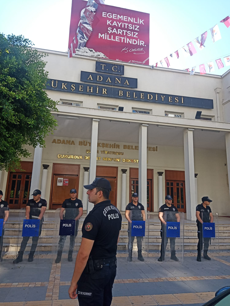 Zeydan Karalar'ın gözaltına alınmasının ardından Adana Büyükşehir Belediyesi binası önünde güvenlik önlemleri alındı ve belediye binası içinde arama yapıldı.