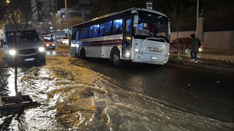 Çukurova ilçesinde su borusunun patlaması sonucu yol çöktü, özel halk otobüsünün arka tekeri yaklaşık 1 metrelik çukura düştü.