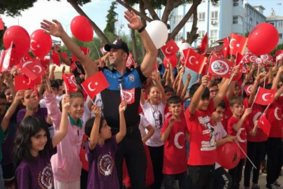 Polisler öğrencilere, bayrak, şeker ve balon dağıttı.