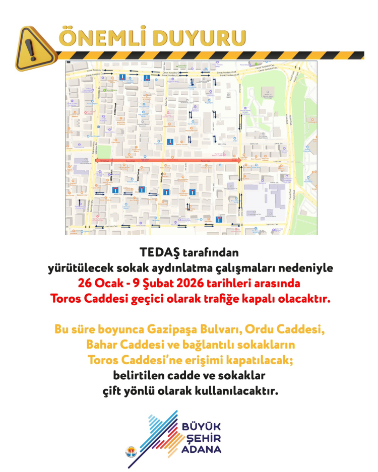 Adana Büyükşehir Belediyesi, kent merkezinin önemli ulaşım arterlerinden biri olan Toros Caddesi’nin geçici süreyle araç trafiğine kapatılacağını duyurdu. TEDAŞ tarafından gerçekleştirilecek sokak aydınlatma çalışmaları kapsamında bölgede trafik düzenlemesi yapılacak. Belediyeden yapılan açıklamaya göre çalışmalar 26 Ocak 2026 tarihinde başlayacak ve 9 Şubat 2026 tarihine kadar devam edecek. Yaklaşık iki hafta sürecek çalışmalar kapsamında Toros Caddesi’ndeki aydınlatma sistemleri yenilenerek daha modern ve güvenli bir hale getirilecek.