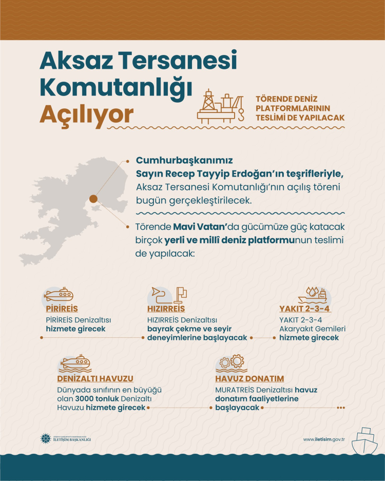 Doğu Akdeniz'de stratejik öneme sahip Aksaz Tersane Komutanlığı, Cumhurbaşkanı Recep Tayyip Erdoğan'ın katılımıyla düzenlenen törenle hizmete açılıyor. Yeni tesis, Türk Donanması'na güç katarken, yabancı donanmalara da lojistik destek sağlayacak.