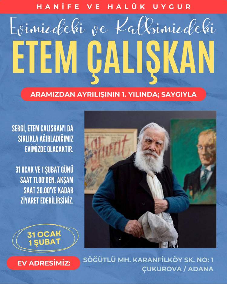 Altınoran Düşünce ve Sanat Derneği Onursal Başkanı Dr. Haluk Uygur ve eşi Hanife Uygur ’un ev sahipliğinde, 31 Ocak ve 1 Şubat tarihlerinde “Evimizdeki ve Kalbimizdeki Etem Çalışkan” adlı serginin saat 11.00 ile 20.00 arasında ziyaret edilebileceği belirtildi. Uygur Ailesi, Prof. Dr. Atilla Arıdoğan ve Adana Alparslan Türkeş Bilim ve Teknoloji Üniversitesi koleksiyonlarında yer alan Etem Çalışkan’ın nadide eserlerinin sanatseverlerle buluşacağı ifade edildi.