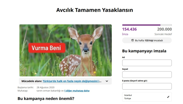 Avcılığın yasaklanması için bir araya gelen 235 sivil toplum kuruluş, change.org üzerinden bu konuda ortak kampanya başlattı. Kampanyada 155 bine yakın imzaya ulaşıldı. Kampanya ile ilgili şunlar kaydedildi: