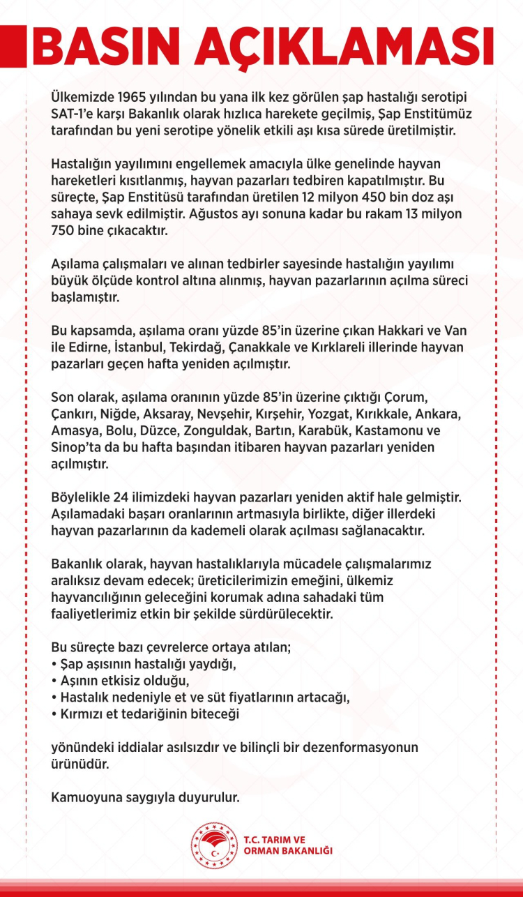Bakanlık açıklamasında, hastalığın yayılmasını engellemek amacıyla hayvan hareketlerinin kısıtlandığı ve hayvan pazarlarının geçici olarak kapatıldığı belirtildi. Bu süreçte Şap Enstitüsü tarafından üretilen 12 milyon 450 bin doz aşının sahaya sevk edildiği, ağustos sonuna kadar bu sayının 13 milyon 750 bine ulaşacağı ifade edildi.