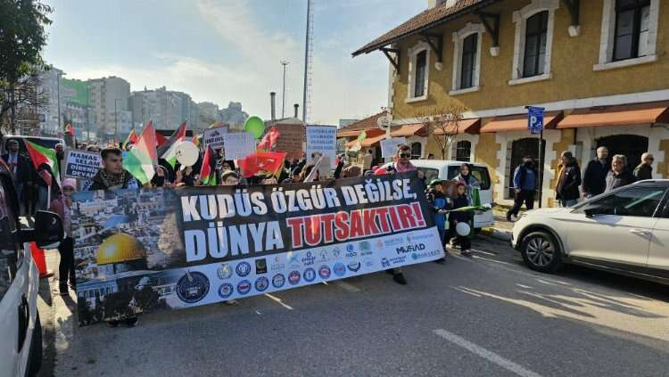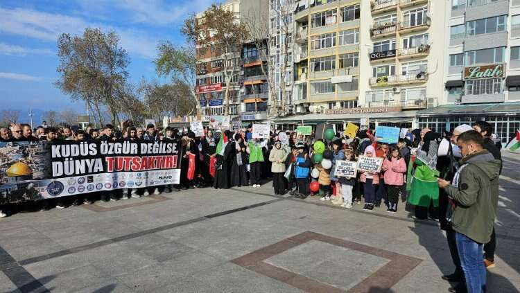 Balıkesir'in Bandırma ilçesinde 10 Aralık İnsan Hakları Günü'nde İsrail'e tepki, Filistin'e destek amacıyla yürüyüş gerçekleştirildi.