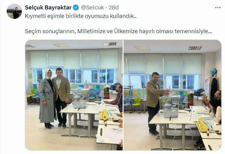 Baykar Yönetim Kurulu Başkanı ve Teknoloji Lideri Selçuk Bayraktar eşi Sümeyye Bayraktar’la birlikte kulandı. Bayraktar, oy kullanma anını sosyal medya hesabından” Kıymetli eşimle birlikte oyumuzu kullandık. Seçim sonuçlarının, milletimize ve ülkemize hayırlı olması temennisiyle” notu ile paylaştı.