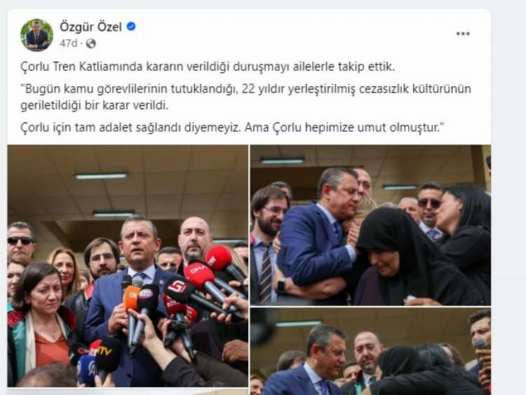 CHP Lideri Özgür Özel, 25 kişinin hayatını kaybettiği, 328 kişinin yaralandığı Çorlu'daki tren kazası kararı sonrası dikkat çeken paylaşım yaptı. Özel, toplam 108 yıl 4 ay hapis cezası verilen kararla ilgili, "Bugün kamu görevlilerinin tutuklandığı, 22 yıldır yerleştirilmiş cezasızlık kültürünün geriletildiği bir karar verildi." ifadesi kullandı.