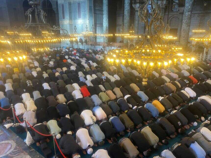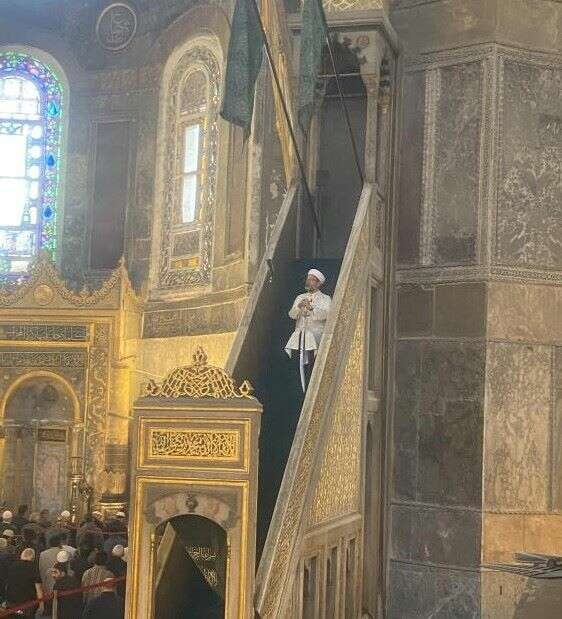 Diyanet İşleri Başkanı Prof.Dr. Ali Erbaş Cuma namazını Ayasofya Camii’nde kıldırdı. Erbaş, hutbeyi okumak için minbere elinde kılıç ile çıktı. İsrail’in Filistin’e yaptığı saldırıları konu alan “Rahmet ve Sekinet Müjdesi: İnşirah Suresi” başlıklı Cuma hutbesini okudu. Hutbesinde tüm insanlığa seslenen Erbaş, mazlumun yanında durma çağrısı yaptı.