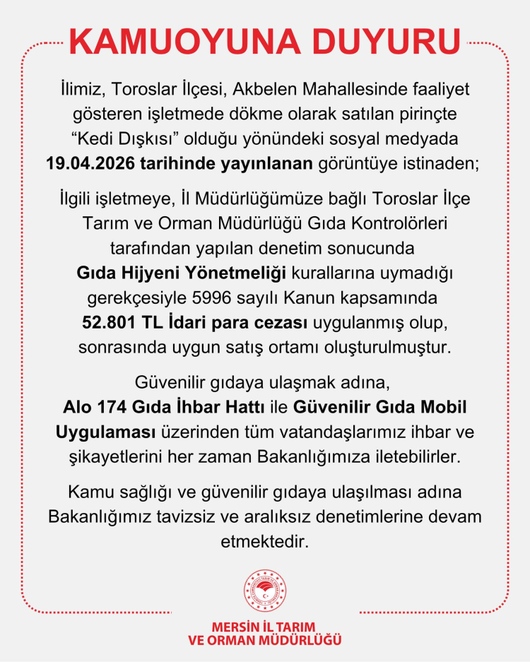 Müdürlükten yapılan açıklamaya göre; 19 Nisan 2026 tarihinde sosyal medya platformlarında paylaşılan ve Mersin’in Toroslar İlçesi Akbelen Mahallesi’nde faaliyet gösteren bir işletmede dökme pirinç içerisinde kedi dışkısı olduğunu gösteren görüntüler ihbar kabul edildi.