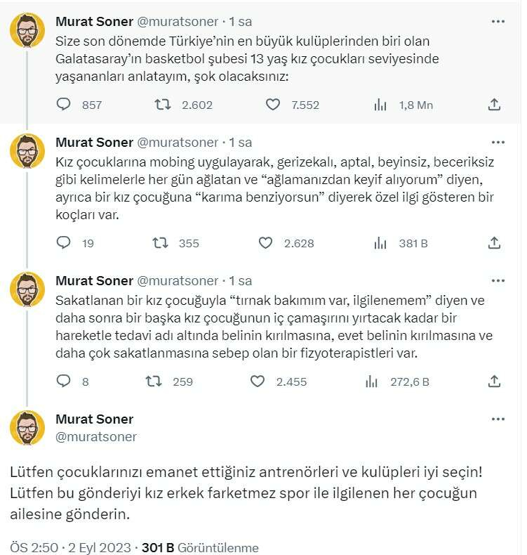 “Size son dönemde Türkiye’nin en büyük kulüplerinden biri olan Galatasaray’ın basketbol şubesi 13 yaş kız çocukları seviyesinde yaşananları anlatayım, şok olacaksınız” ifadelerini kullanan Soner, kız çocuklarına mobing uygulandığını iddia etti.