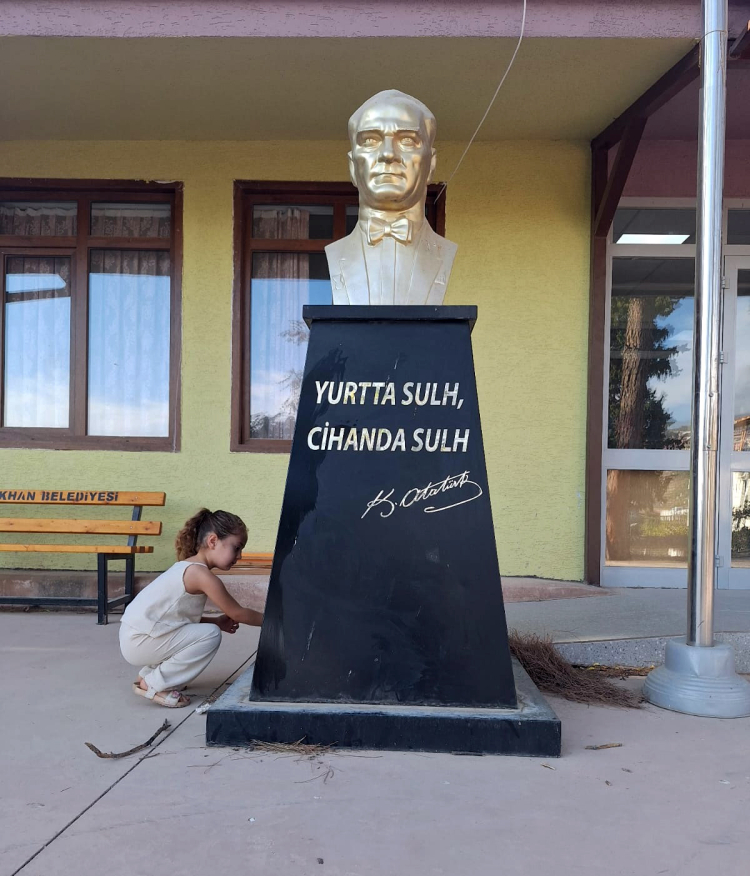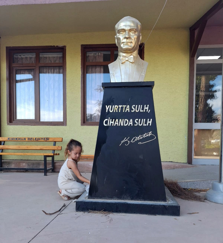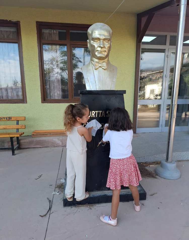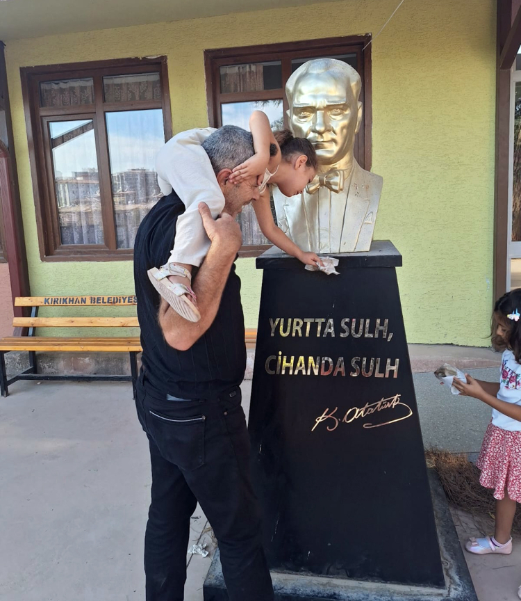 Babasının omuzlarında yükselen minik Gökçe, elindeki bezle Mustafa Kemal Atatürk'ün büstünü büyük bir özenle sildi. O anlar, hem okul yönetimi hem de çevredeki vatandaşlar tarafından takdirle karşılandı. "Yurtta Sulh, Cihanda Sulh" yazılı büstü temizlerken objektiflere yansıyan Gökçe ve Buket’in bu hareketi, yeni eğitim öğretim yılının başlamasıyla birlikte geleceğin teminatı olan çocukların atalarına duyduğu saygının ve sahip çıkma bilincinin en güzel örneklerinden biri oldu.