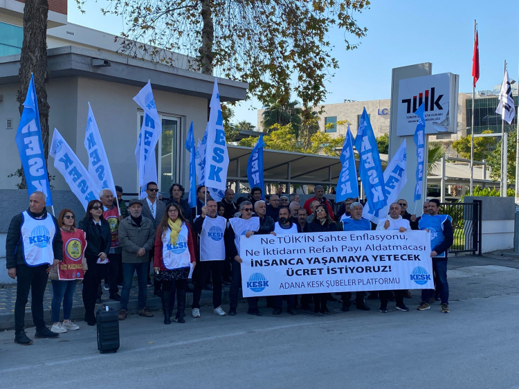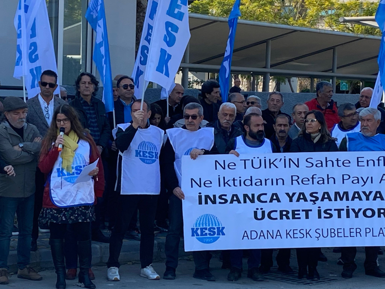BES Adana Şube Başkanı Fatma Sarıoğuz Güney, Bugün, KESK’e bağlı sendikaların üyeleri olarak yurdun dört bir yanında alanlardayız. Her geçen gün daha fazla itildiğimiz yoksulluk ve sefalet girdabına teslim olmayacağımızı haykırmak, hakkımız olanı istemek için TÜİK binalarının önündeyiz. İliklerimize kadar yaşadığımız zam yağmuru ortada. Çarşıda, pazarda, mutfakta TÜİK rakamlarının en az iki katı enflasyon yaşıyoruz. Ama işçisinden, asgari ücretlisine kamu emekçisinden emeklisine hepimizin ücret- maaş artışlarında her seferinde TÜİK’in sahte enflasyon verileri temel alınıyor" diye ifade etti.