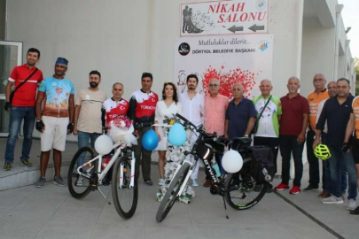 Nikah törenine gelin arabası yerine bisikletle gitmeyi tercih eden çift, giydikleri gelinlik ve damatlıkla 10 kilometre pedal çevirerek Dörtyol Belediyesi nikah salonuna ulaştı.