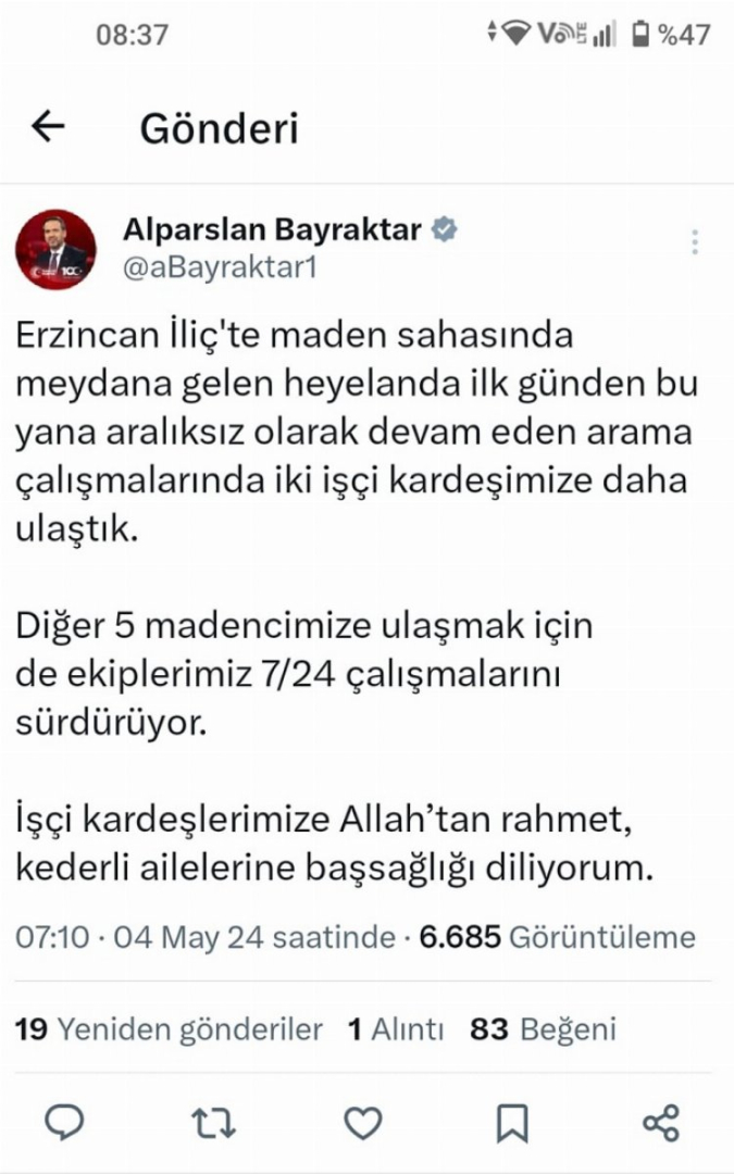 Bakan Bayraktar, diğer 5 işçiye ulaşmak için de ekiplerin 7/24 çalışmalarını sürdürdüğünü belirterek, "İşçi kardeşlerimize Allah'tan rahmet, kederli ailelerine başsağlığı diliyorum." ifadesi kullandı.