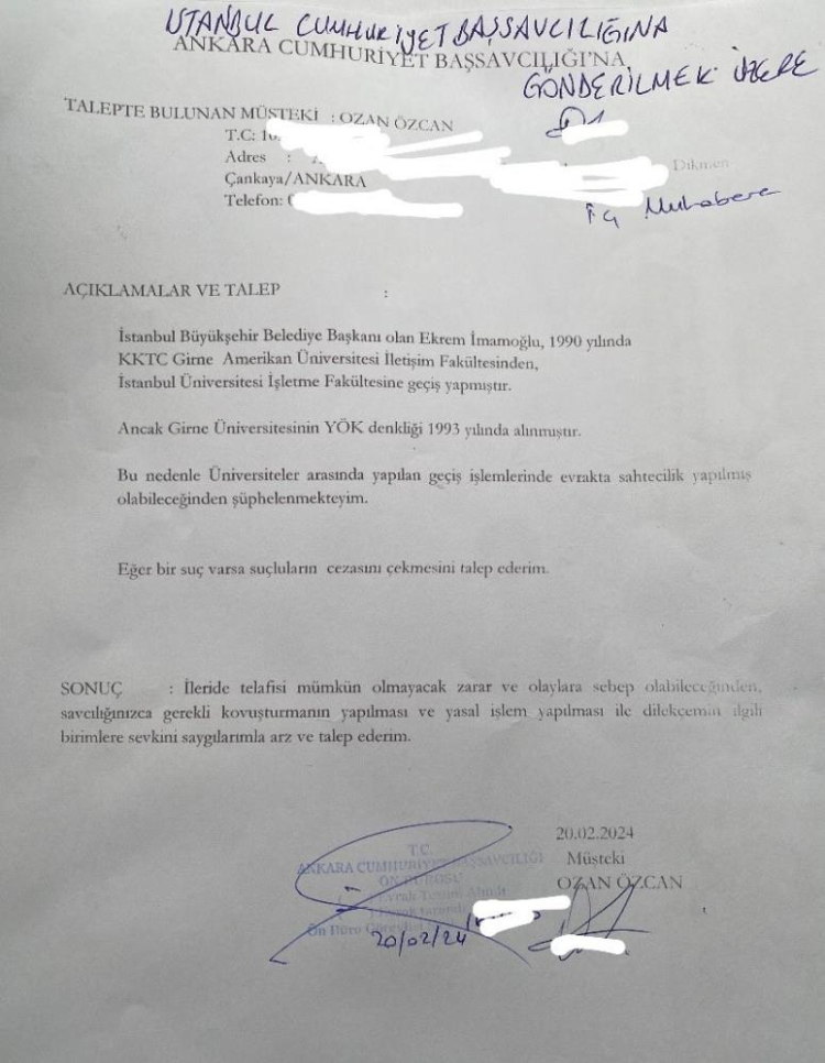 İstanbul Büyükşehir Belediye Başkanı Ekrem İmamoğlu'nun diplomasının iptal edilmesi için suç duyurusunda bulunan Ozan Özcan,.Ankara'da yaşayan Hacettepe Üniversitesi Uluslararası İlişkiler Bölümü mezunu Ozan Özcan, bir gazetede İmamoğlu'nun diplomasına ilişkin haberi okumasının ardından durumu araştırmaya başladı. Araştırmaları esnasında YÖK denkliğinin Girne Amerikan Üniversitesi'ne 1993 yılında verildiğini fark eden Özcan, İmamoğlu'nun bu tarihten önce geçiş yaptığını fark etti. Bunun üzerine Özcan, Belediye Başkanı İmamoğlu'nun Girne Amerikan Üniversitesinden İstanbul Üniversitesi'ne geçiş sürecinde 'evrakta sahtecilik' şüphesiyle 20 Şubat 2024 tarihinde savcılığa suç duyurusunda bulundu. Suç duyurusunun ardından silahlı tehdit mesajları aldığını söyleyen Özcan, İstanbul Üniversitesi tarafından alınan diploma iptal kararı için mutlu olduğunu kaydetti.