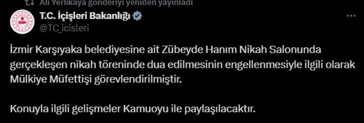 İzmir’de, Karşıyaka Zübeyde Hanım Nikah Sarayı’nda din görevlisinin nikah öncesi dua okuma isteği kadın nikah memuru tarafından tepkiyle karşılandı. Nikah memurunun, “Burası resmi daire dua okumanıza müsaade edemeyiz, evinizde yapabilirsiniz” diyerek elinden mikrofonu aldığı din görevlisi dua ederken, salonda yüksek sesle müzik açıldı. İçişleri Bakanlığı olayın soruşturması için Mülkiye Müfettişi görevlendirildiğini açıkladı.