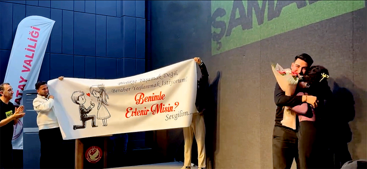 Eğlenceli skeçleri, anlık doğaçlamaları ve seyirciyle kurduğu güçlü bağla dikkat çeken “Tiyatro Şamata”, bu kez yalnızca kahkaha değil, duygu dolu anlar da yaşattı. Sahnede gerçekleşen evlilik teklifi, geceyi izleyenler için unutulmaz bir hatıraya dönüştü.
